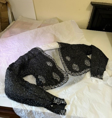 For the first time, work has begun on reviewing the textile collection at Dunollie. This is an exciting milestone, and we’ve already uncovered some fascinating treasures, including this gorgeous, beaded dinner jacket and embellished bolero.