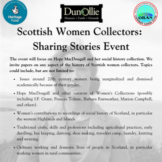 We have also started preparations for the first of our projects, inspired by Hope MacDougall’s collection and focusing on other Scottish women collectors and historians. Hope’s social history collection resides here at Dunollie under the care of the MacDougall of Dunollie Preservation Trust, and serves as the inspiration for this event. Hope dedicated her life to her passion, which was documenting the social history of Scotland’s highlands and islands, and she amassed a 5,000+ object strong collection, and significant related archive.